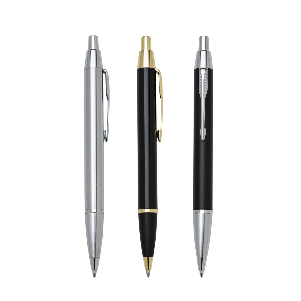 Caneta metal colorida com detalhes. Clip de metal com relevo, as cores dos detalhes variam conforme a cor da caneta, que são: clip, acionador, anel inferior e ponteira. Aciona por clique.
