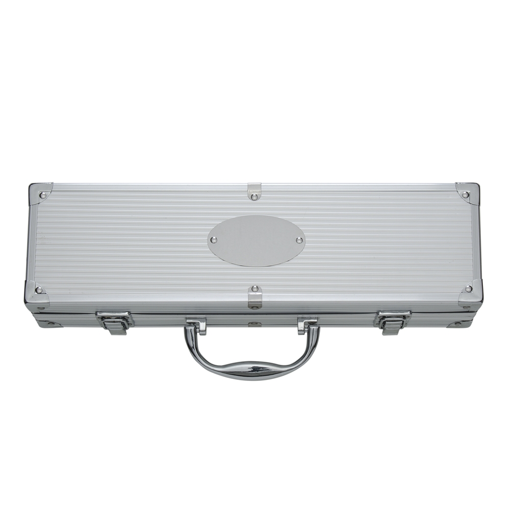 "Kit churrasco 4 peças em maleta de alumínio com relevo. Possui: espátula, pegador, garfo e faca em inox(todas peças possuem proteção plástica) detalhes em metal nas bordas da maleta, duas dobradiças na parte inferior, uma alça e duas presilhas para travar/abrir maleta. Parte interna revestida de tecido tnt e velcro para guardar as peças." observação: Maleta 13,1 cm x 38 cm x 6,9 cm – Espátula 34 cm x 7 cm – Pegador 34,3 cm x 6 cm – Garfo 33,7 cm x 3,3 cm – Faca 32,4 cm x 2,6 cm