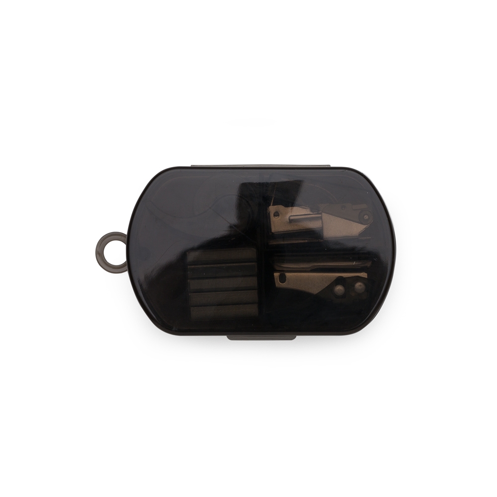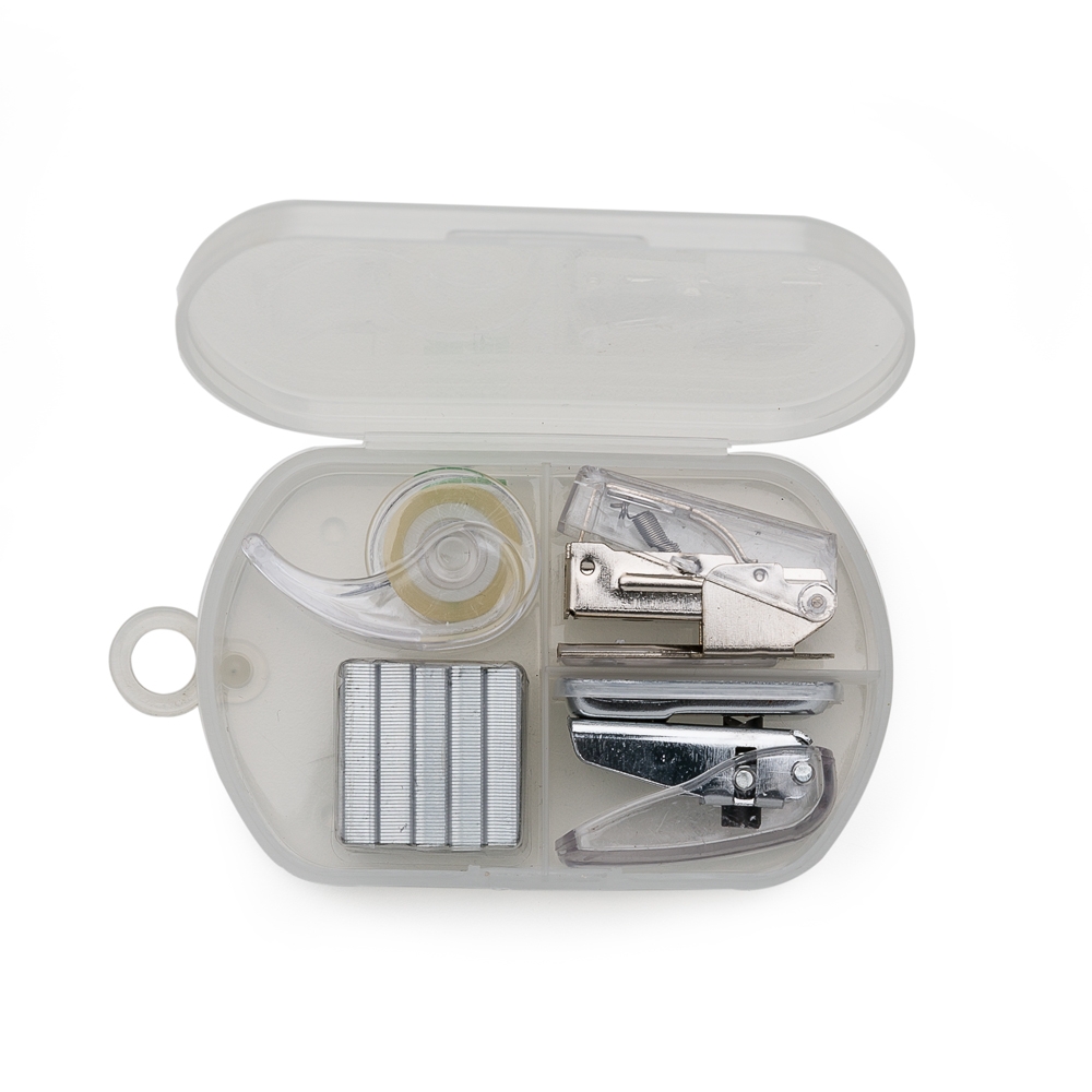 Kit escritório 4 peças em estojo plástico. Possui grampeador, conjunto com dez grampos, furado de papel e fita adesiva. Possui tampa lisa e verso com relevo das três divisórias internas, suporte na lateral para pendurar item caso necessário.