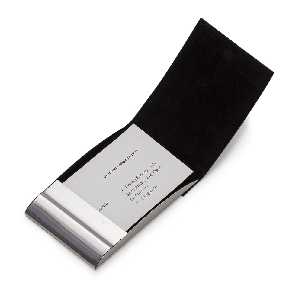 Porta cartão em couro sintético com detalhe em metal espelhado para personalização(inferior frontal, verso também brilhante), fecha/abre por imã. Parte interna revestida de veludo.