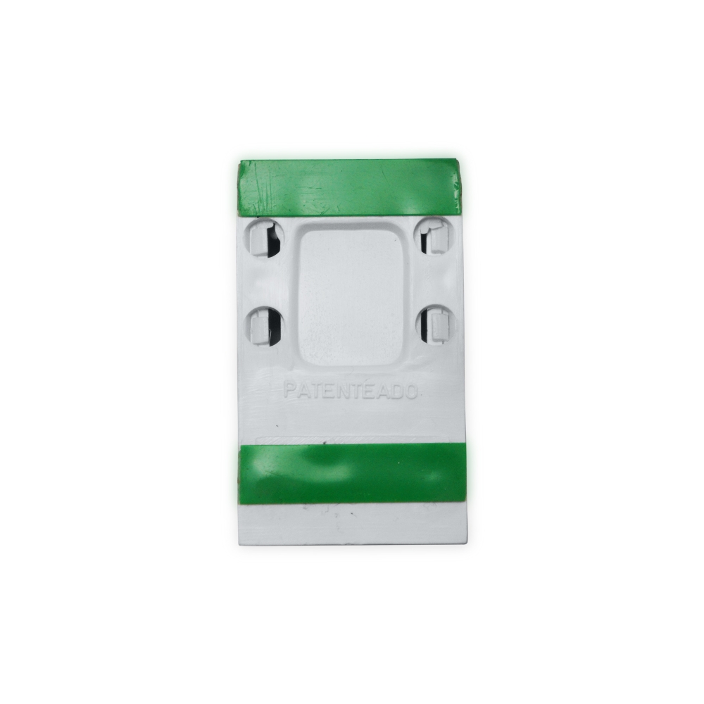 Porta recado plástico branco. Para utilizar basta colocar o papel afim de que a esfera plástica interna segure ele, para remover o papel é necessário puxá-lo pela lateral, caso puxe frontalmente a esfera mantém ele preso. Possui dois adesivos na parte inferior.
