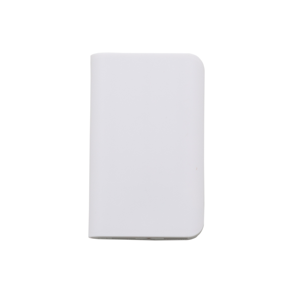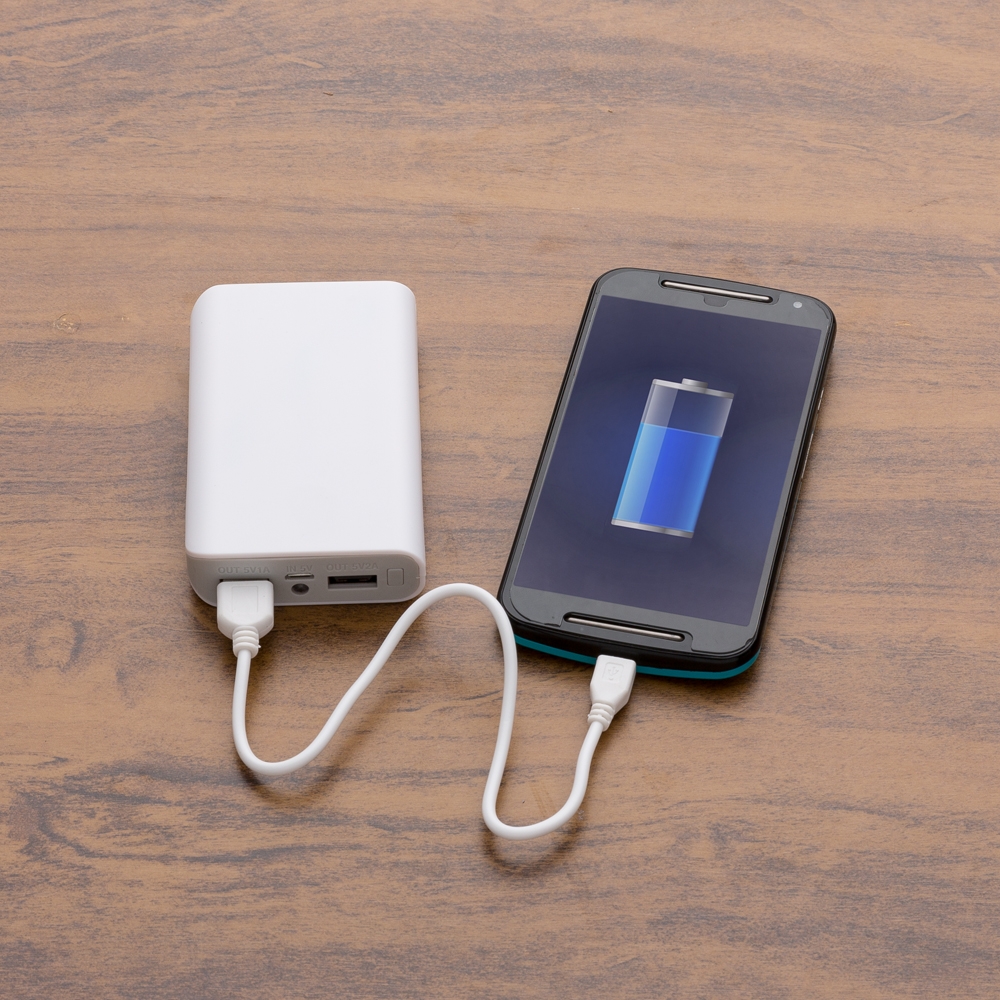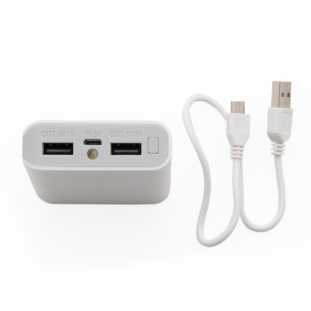 Powerbank plástico com lanterna. Possui duas saídas de 5V, sendo uma de 1A e outra de 2A. Possui luz de emergência e indicadores de carga. Acompanha 1 cabo usb/v8